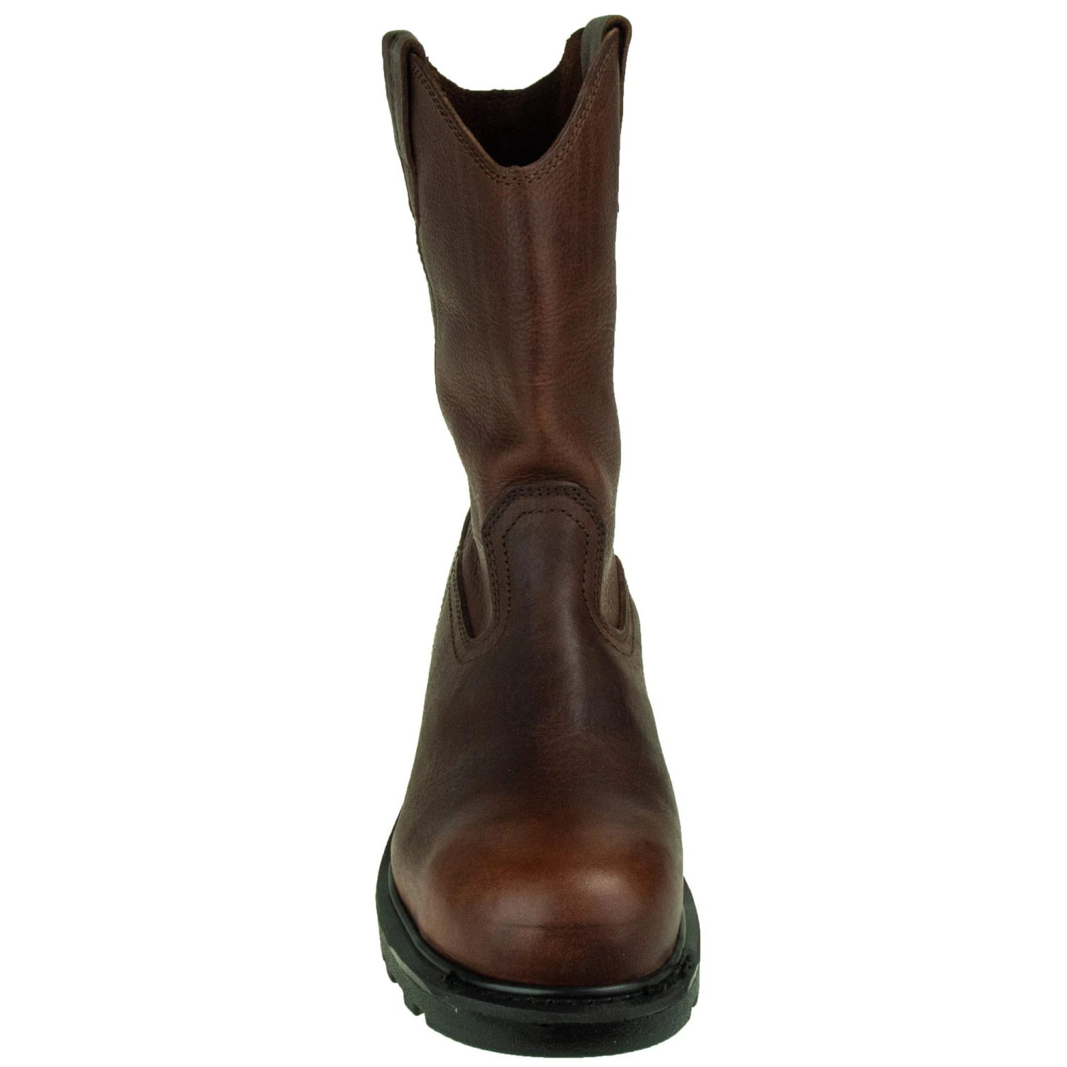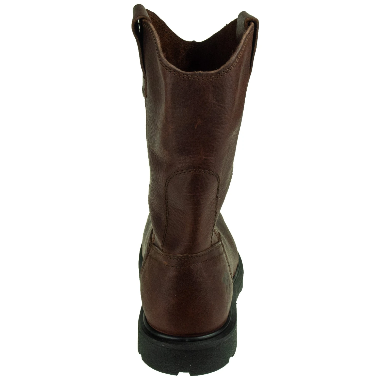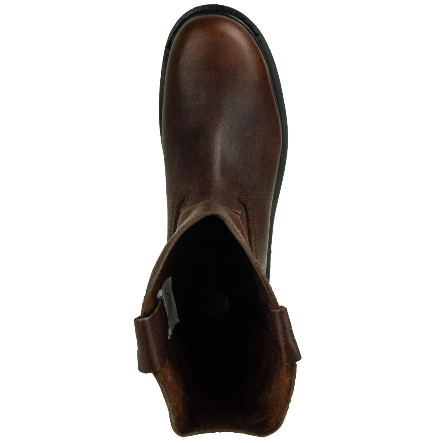 These smooth, laceless wellington boots are crafted with reddish-brown leather to surround feet with soft flex and supple pliancy. Leather knows how to move and bend, but still stands up to wear and tear. The 10-inch shafts have a handsome, natural gleam. Use the side zippers on these work boots to keep your feet securely inside.